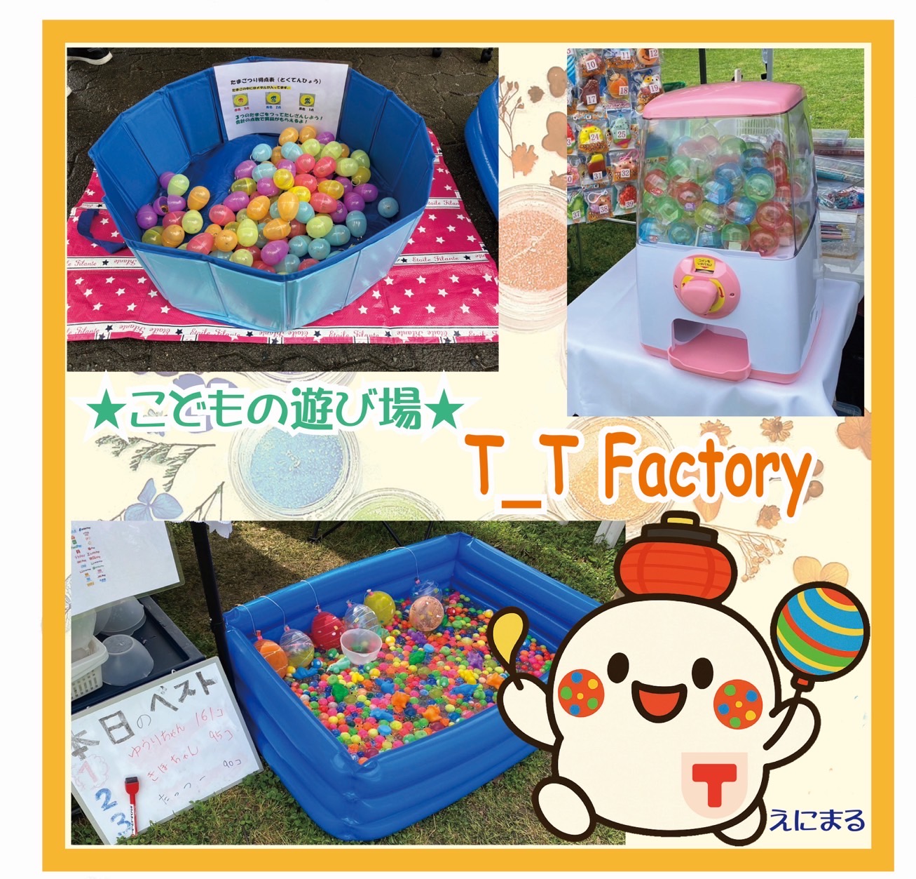 スーパーボールすくい、宝石すくい、恐竜射的などの子供の遊び場とハーバリウムボールペンなどのワークショップ